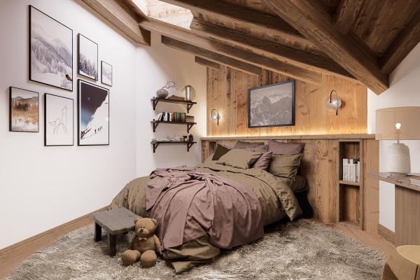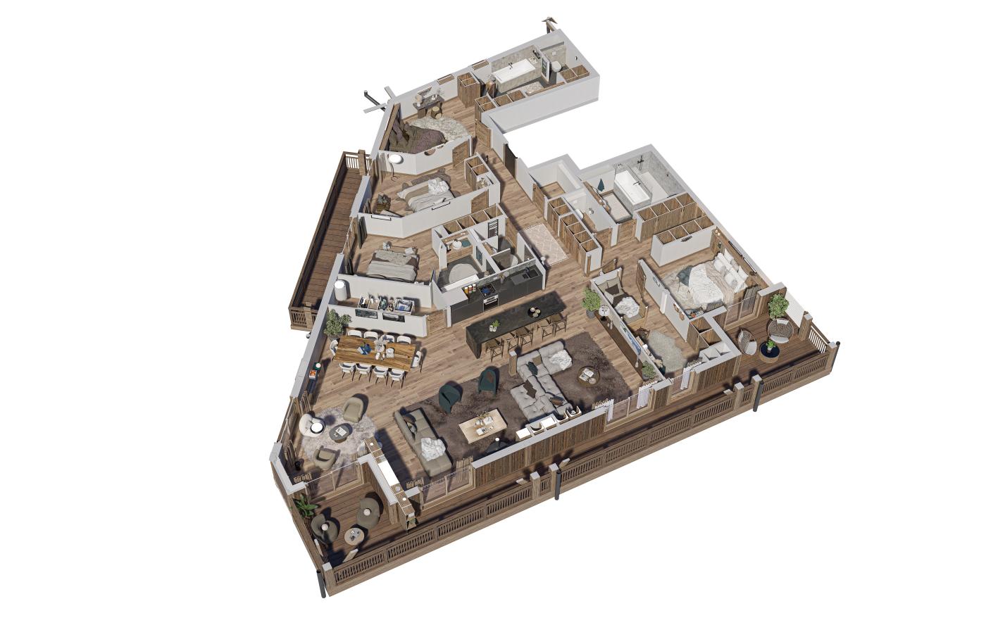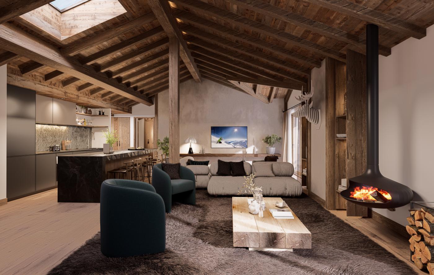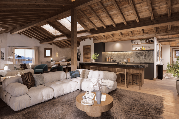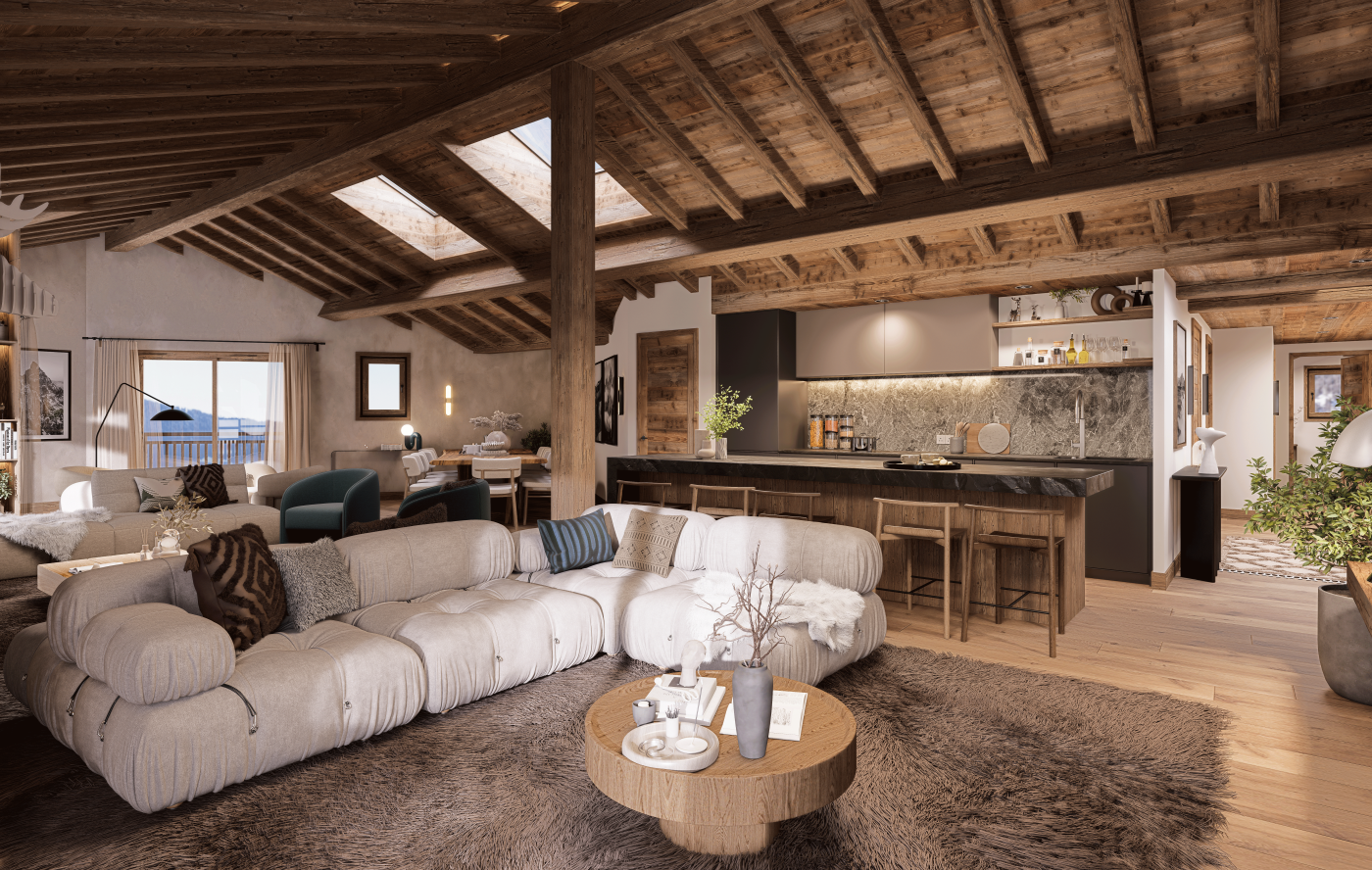 Du T3 + cabine au T5 + cabine entièrement sous les comble, les surfaces généreuses, de 82 m² à 214 m², offrent des volumes remarquables et une qualité de vie rare en station.