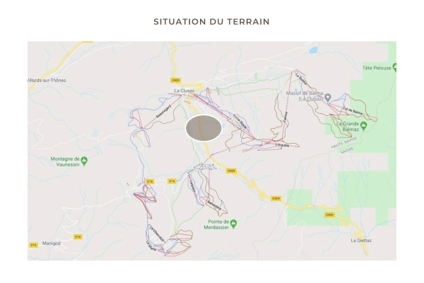 Le terrain se situe sur la commune de la Clusaz, dans le secteur du Gotty avec une très belle orientation sur le versant Sud/Ouest de la vallée des Aravis.